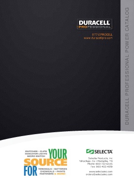 877-2PROCELL DURACELL PROFESSIONAL POWER CATALOG www.duracellpro.com Selecta Products, Inc Tehachapi, Ca • Memphis, TN Phone: 800-722-6445 Fax: 800-433-4319 www.selectainc.com orders@selectainc.com